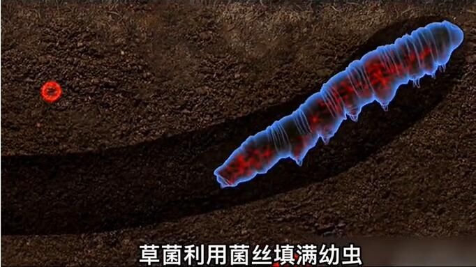 草菌利用菌絲填滿幼蟲,直接把它們變成僵蟲,然后等到春暖花開之際再控制僵蟲的身體,爬出土壤,并從頭不長出一個棍棒狀的子座,在子座上會有許多孢子,等到孢子成熟后便會撒向土壤中繼續(xù)下一個循環(huán)。